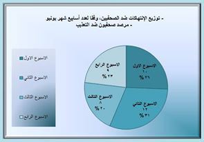 وثق مرصد “صحفيون ضد التعذيب”، 39 حالة انتهاك مختلفة ضد الصحفيين أثناء أداء مهامهم، خلال شهر يونيو، حيث تم تسجيل 10 حالات انتهاك خلال الأسبوع الأول، و12 واقعة انتهاك في الأسبوع الثاني، و8 حالات في الأسبوع الثالث، وفي الأسبوع الرابع 9 حالات انتهاك.