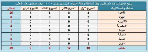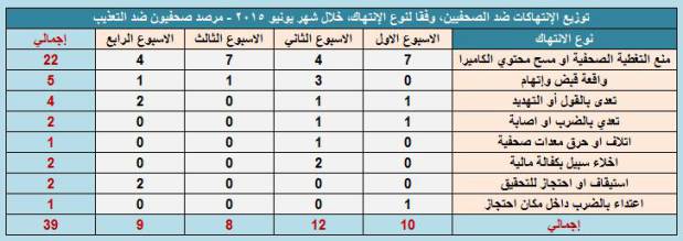 وأوضح المرصد خلال تقريره الشهرى عن شهر يونيو 2015 لرصد وتوثيق الانتهاكات ضد الصحفيين والإعلاميين، أنه تم تسجيل 22 واقعة منع من التغطية بحق الصحفيين بعدد من الأماكن المختلفة، و5 وقائع قبض وتوجيه إتهام، و4 حالات تعدي بالقول أو التهديد، وحالتين إخلاء سبيل بكفالة مالية، وحالتين تعدي بالضرب أو إصابة، وحالتين إستيقاف أو إحتجاز للتحقيق، وحالة واحدة إتلاف أو حرق معدات صحفية، وحالة واحدة اعتداء بالضرب داخل مكان الإحتجاز.