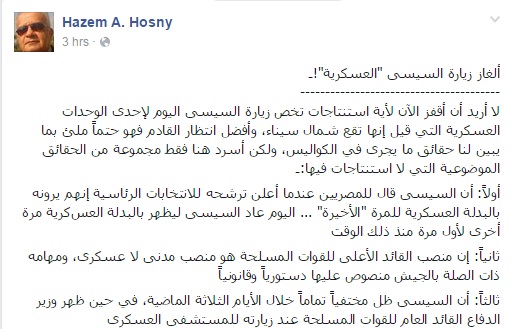 وكتب حازم، في منشور عبر صفحته على موقع “فيس بوك”: “لا أريد أن أقفز الآن لأي استنتاجات تخص زيارة السيسي اليوم لإحدى الوحدات العسكرية التي قيل إنها تقع شمال سيناء، وأفضّل انتظار القادم فهو حتما مليء بما يبين لنا حقائق ما يجرى في الكواليس، ولكن أسرد هنا فقط مجموعة من الحقائق الموضوعية لا استنتاجات”.