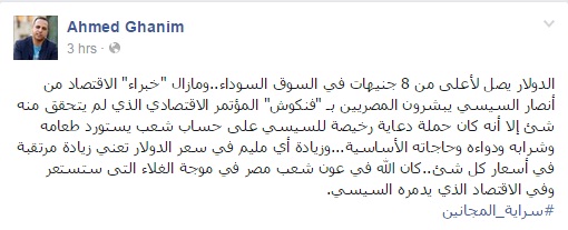 وكتب غانم، في منشور عبر صفحته على موقع “فيس بوك”: “الدولار يصل لأعلى من 8 جنيهات في السوق السوداء.. وما زال “خبراء” الاقتصاد من أنصار السيسي يبشرون المصريين بـ”فنكوش” المؤتمر الاقتصادي الذي لم يتحقق منه شيء، إلا أنه كان حملة دعاية رخيصة للسيسي على حساب شعب يستورد طعامه وشرابه ودواءه وحاجاته الأساسية”، وأشار إلى أن زيادة أي مليم في سعر الدولار تعني زيادة مرتقبة في أسعار كل شيء.