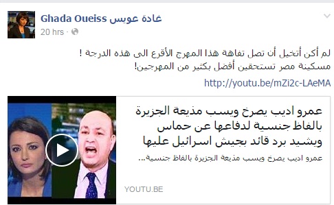 انتقدت الإعلامية غادة عويس، مقدمة البرامج الفضائية بقناة “الجزيرة”، تطاول عمرو أديب، مقدم البرامج الفضائية، لفظيًا على شخصها خلال برنامجه أول أمس.