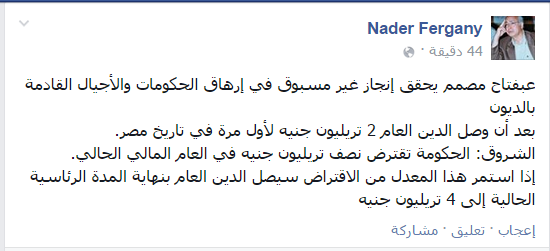 وقال -عبر منشور له على “فيس بوك”-: “عبفتاح مصمم يحقق إنجاز غير مسبوق في إرهاق الحكومات والأجيال القادمة بالديون، بعد أن وصل الدين العام 2 تريليون جنيه لأول مرة في تاريخ مصر”.