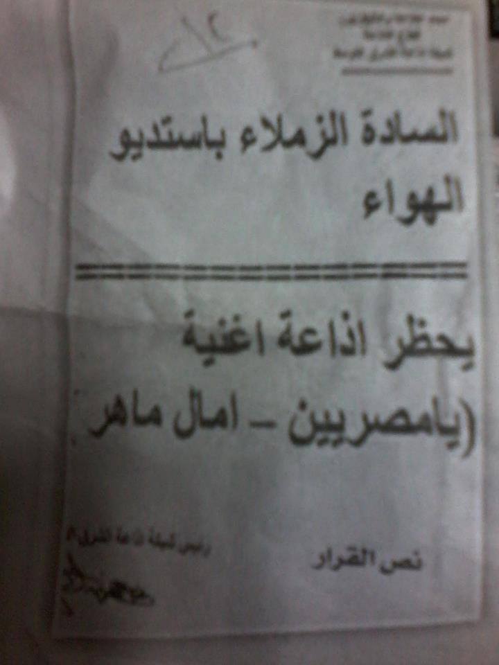 ونشر الشهاوي نسخة من القرار عبر صفحته الرسمية على موقع “فيس بوك”: “والذي كتب فيه (السادة الزملاء باستوديو الهواء.. يحظر إذاعة أغنية يا مصريين- أمال ماهر).