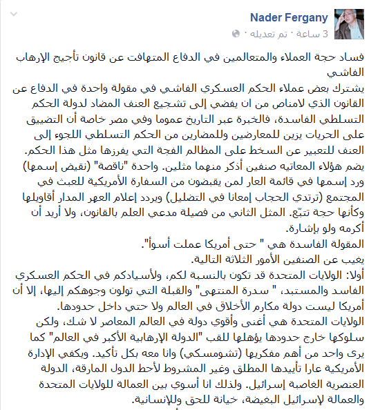 قال نادر فرجاني، أستاذ العلوم السياسية بجامعة القاهرة، إن بعض عملاء الحكم العسكري يشتركون في مقولة واحدة في الدفاع عن القانون (مكافحة الارهاب) الذي لا مناص من أن يفضي إلى تشجيع العنف المضاد لدولة الحكم التسلطي الفاسدة.