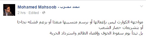 وكتب “محسوب”، في منشور له عبر صفحته على موقع التواصل الاجتماعي “فيس بوك”: “مواجهة الكوارث ليس بإغفالها أو برسم متسببها منقذا أو بزعم فشله نجاحًا أو بتشريعات حصار الشعب، بل تبدأ يوم سقوط الخوف وإقصاء الظالم واسترداد الحرية”.