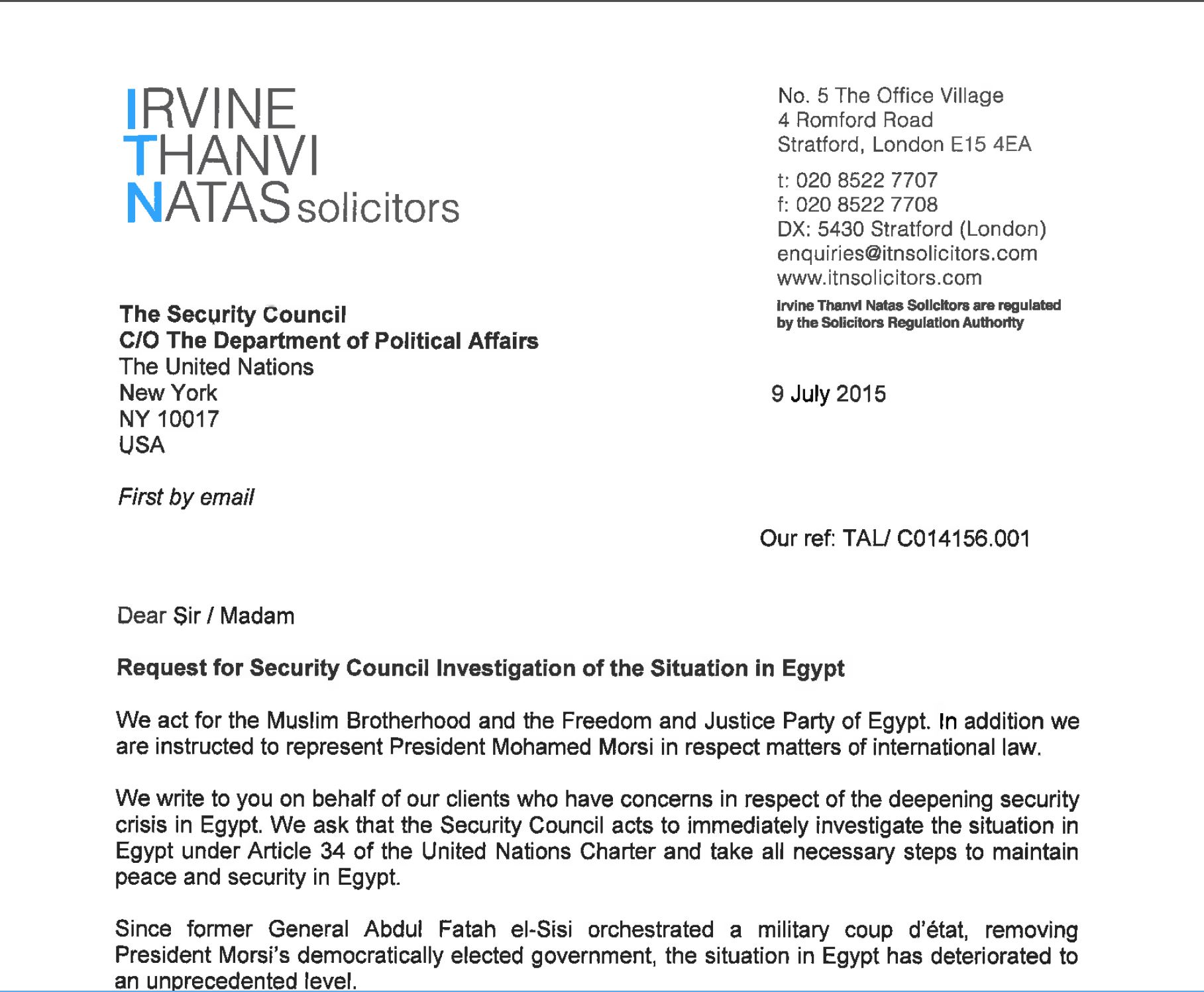 طالب الفريق القانوني الدولى المكلف من حزب الحرية والعدالة، رئيس وأعضاء مجلس الأمن الدولي، في رسالة إجراء تحقيق في الأوضاع الأمنية المتردية في مصر، تحت البند 34 من ميثاق الأمم المتحدة.