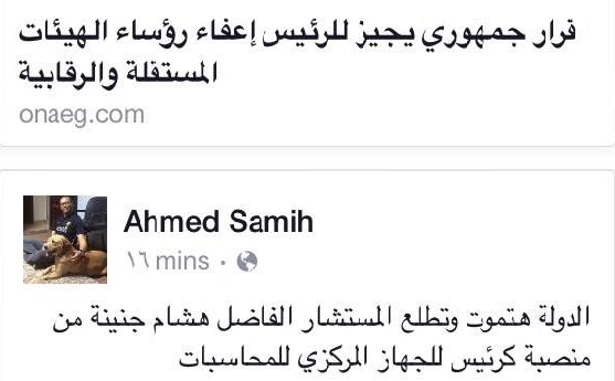 وكتب “سميح” في منشور له عبر صفحته الرسمية على موقع “فيس بوك”: “الدولة هتموت وتطلع المستشار الفاضل هشام جنينة من منصبه كرئيس للجهاز المركزي للمحاسبات”.