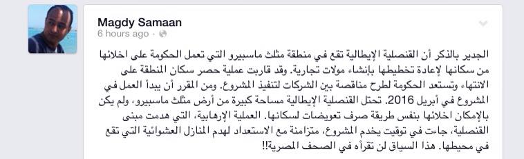 وكتب سمعان، في منشور له عبر صفحته الرسمية على موقع “فيس بوك”: “الجدير بالذكر أن السفارة الإيطالية تقع في منطقة مثلث ماسبيرو، التي تعمل الحكومة على إخلائها من سكانها لإعادة تخطيطها بإنشاء مولات تجارية. وقد قاربت عملية حصر سكان المنطقة على الانتهاء، وتستعد الحكومة لطرح مناقصة بين الشركات لتنفيذ المشروع. ومن المقرر أن يبدأ العمل في المشروع في أبريل 2016. تحتل القنصلية الإيطالية مساحة كبيرة من أرض مثلث ماسبيرو، ولم يكن بالإمكان إخلاؤها بنفس طريقة صرف تعويضات لسكانها”.