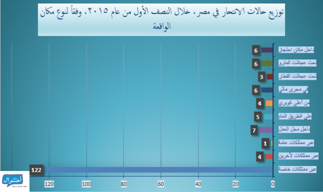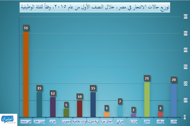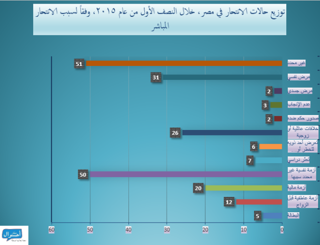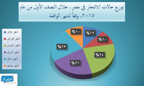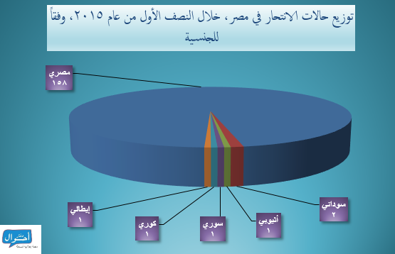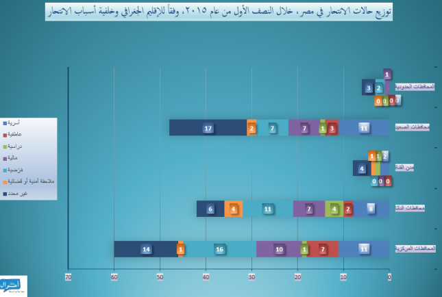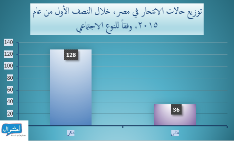 خلال النصف الأول من عام 2015، تم رصد 164 حالة انتحار في مصر، موزعين عبر جميع محافظات الجمهورية، عدا محافظتي جنوب سيناء والوادي الجديد، بينهم 128 من الذكور و 36 من الإناث.