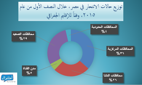 خلال النصف الأول من عام 2015، تم رصد 164 حالة انتحار في مصر، موزعين عبر جميع محافظات الجمهورية، عدا محافظتي جنوب سيناء والوادي الجديد، بينهم 128 من الذكور و36 من الإناث.