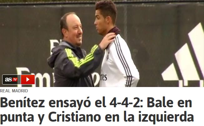 وقد أكدت الصحيفة المقربة من نادي ريال مدريد الإسباني أن رافا بينيتيز، يفكر في اللعب بخطة 2-4-4، وإشراك النجم البرتغالي كريستيانو رونالدو مهاجما صريحا بجانب الفرنسي كريم بنزيما.