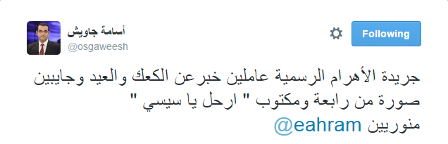 تعليقًا على الصورة، قال الإعلامي، أسامة جاويش: “جريدة الأهرام الرسمية عاملين خبرعن الكعك والعيد وجايبين صورة من رابعة ومكتوب: ” ارحل يا سيسي “منوريين @eahram“.