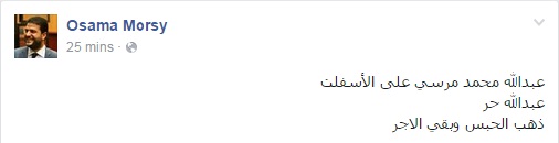وعلق شقيقه المحامي أسامة مرسي على قرار إخلاء سبيله عبر منشور مصغر في صفحته الرسمية بموقع “فيس بوك”: “عبد الله محمد مرسي على الأسفلت.. عبد الله حر.. ذهب الحبس وبقي الأجر”.