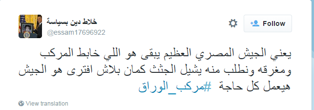 وعلق ‏essam17696922 ساخرًا: “يعني الجيش المصري العظيم يبقى هو اللي خابط المركب ومغرقه، ونطلب منه يشيل الجثث كمان.. بلاش افترى هو الجيش هيعمل كل حاجة”.