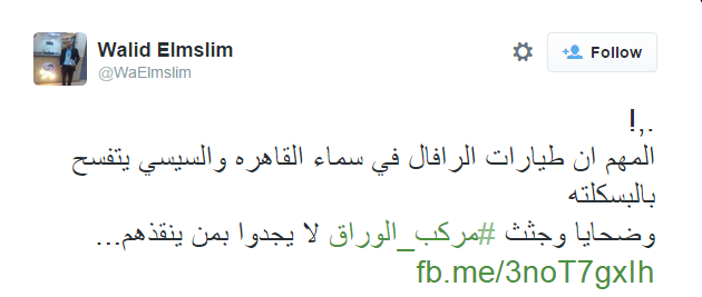 كما سخر Walid Elmslim قائلًا: “المهم إن طيارات الرافال في سماء القاهرة والسيسي يتفسح بالبسكلتة، وضحايا وجثث مركب الوراق لا يجدون من ينقذهم”.