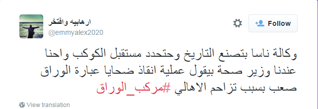 وقال حساب باسم “إرهابية وافتخر”: “وكالة ناسا بتصنع التاريخ وحتحدد مستقبل الكوكب، واحنا عندنا وزير صحة بيقول عملية إنقاذ ضحايا عبارة الوراق صعب بسبب تزاحم الأهالي”.