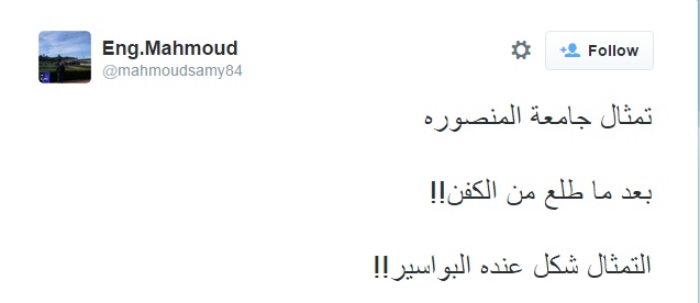 وقال ‏AhmedBadran81: “ده تمثال جامعة المنصورة دي عارفنها إنما والنبي اللي يعرف آيه ده يقولي”.