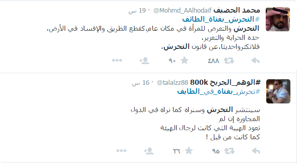 من جانبه، قال المواطن السعودي محمد الحضيف ‏Mohmd_AAlhodaif: “إن التحرش والتعرض للمرأة في مكان عام، كقطع الطريق والإفساد في الأرض، حده الحرابة والتعزير، فلا تكثروا حديثا عن قانون التحرش”، بينما ذكر حساب يُدعي الوهم- الجريح: “سينتشر التحرش وسنراه كما نراه في الدول  المجاورة إن لم تعد الهيبة التي كانت لرجال هيئة الأمر بالمعروف والنهي عن المنكر كما كانت من قبل”.