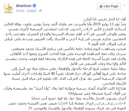 وقالت شريهان في منشور منسوب لها عبر صفحتها الرسمية على موقع التواصل الاجتماعي “فيس بوك”: “منذُ يَوْم 11 يوليو 2015 وأنا وأسرتي نمر بظرف أليم، ومنذُ يومين علمت بوفاة الغالي أستاذي المخرج الكبير رأفت الميهي فدخلت لصفحتي الرسمية لأُعزي نفسي ومصر والوطن العربي في أحد أهم عشاق السينما والإبداع المصري، وفوجئت بأحد المعجبين متكرم يعزيني في ابنة أختي والأستاذ رأفت الميهي ويترحم على غَرقى مركب الوراق، فلم أفهم!”.