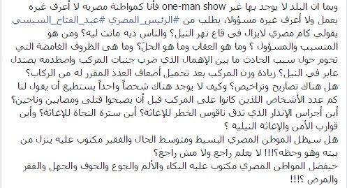 ووجهت بعد ذلك عدة تساؤلات لعبد الفتاح السيسي قائد الانقلاب العسكري، قائلة: “وبما أن البلد لا يوجد بها غير one-man show  فأنا كمواطنة مصرية لا أعرف غيره يعمل ولا أعرف غيره مسؤولا، باطلب من عبدالفتاح السيسي يقول لي كام مصري لا يزال في قاع نهر النيل؟ والناس دي ماتت ليه؟ ومن هو المتسبب والمسؤول؟ وما هو العقاب وما هو الحلّ؟ وما هي الظروف الغامضة التي تحوم حول سبب الحادث ما بين الإهمال الذي ضرب جنبات المركب واصطدامه بصندل عابر في النيل؟ زيادة وزن المركب بعد تحميل أضعاف العدد المقرر له من الركاب؟ هل هناك تصاريح وتراخيص؟ وكيف لا يوجد هناك شخص واحد يستطيع أن يقول لنا كم عدد الأشخاص الذين كانوا على المركب قبل أن يصبحوا قتلى ومصابين وناجين؟ أين أجراس الإنذار الذي تدق ناقوس الخطر للإغاثة؟ أين سترة النجاة للإغاثة؟ وأين قوارب الأمن والإغاثة النيلية؟”.