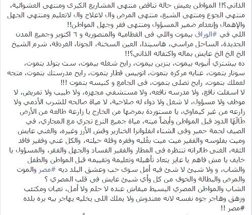 واستنكرت شريهان تدهور أوضاع المواطن المصري: “المواطن يعيش حالة تناقض منتهى المشاريع الكبرى ومنتهى العشوائية، منتهى الجوع ومنتهى الشبع، منتهى المرض واللا علاج واللا تعليم ومنتهى الجهل والإهمال وانعدام ضمير المسؤول ومنتهى فقر وجهل المواطن، اللي في الوراق بيموت واللي في القطامية والمنصورية و٦ أكتوبر وجميع المدن الجديدة، الساحل مراسي، هاسيندا، العين السخنة، الجونا، الغردقة، شرم الشيخ الخ الخ الخ عايش بماله واكتفائه الذاتي؟”.