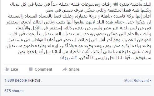 واختتمت شريهان منشورها بقولها: “البلد ماشية بقدرة الله وفئات ومجموعات قليلة ضئيلة جداً في منها في كل مجال ولكنها هيه فقط المنتفعة واللي ممكن تعرف تعيش في مصر، أعلم إنها تركة فاسدة جاهلة و دولة منهارة، وعليك فقط بالفساد الفساد والفسدة لن يتركوا حتى حطام هذه البلد لانهم يعلموا أنها ذهب وماس العالم أجمع، استثمر في من ليس لديه غير مصر وليس من يدعى ذلك، استثمر في الأمل والانتماء والحب والحلم الى ممكن يتحقق ويحقق مستقبل، المستقبل بدأ يموت في قلب المواطن المصري وهو آخر أمل في إحيائه، استثمر في أمان المواطن في مستقبل وطنه وبلده لبكره مش يوم بيومه وهيه موته ولا أكتر، إزرعله وظيفه طموح مستقبل، ابحث على ما يطمئننا على أبنائنا، أَغِث الأحياء من أبنائنا قبل أن يلحقوا بمن سبقوهم .. قُول لنا الحل ياريس إذا أمكن”.