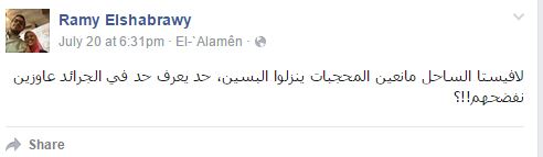 سجلت “منى” بكاميرا تليفونها المحمول لقطات للكلاب وهي تسبح في المياه مع أصحابها، مقررة نشرها على موقع التواصل الاجتماعي “فيس بوك”، متسائلة: “ليه تمنع المحجبات من نزول البحر بالمايوه الشرعي، وإيه الضرر اللي هيسببه مايوه المحجبات؟”، مطالبة وزارة السياحة بالإفصاح عن حقيقة وجود تصريح بمنع المحجبات، كما طالبت بمعاقبة أصحاب هذه الأماكن في حالة عدم وجود أي قرار يمنع دخول المحجبات.
