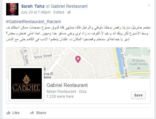وقالت سارة طه: إن مطعم جابرييل مارينا رفض دخولها بسبب الحجاب، قائلة: “المطعم رفض يدخلنا دلوقتي والراجل قالنا بمنتهى قلة الذوق ممنوع محجبات ممكن ادخلكم في وسط الأسبوع، لكن ويك إند وعيد لأ”.