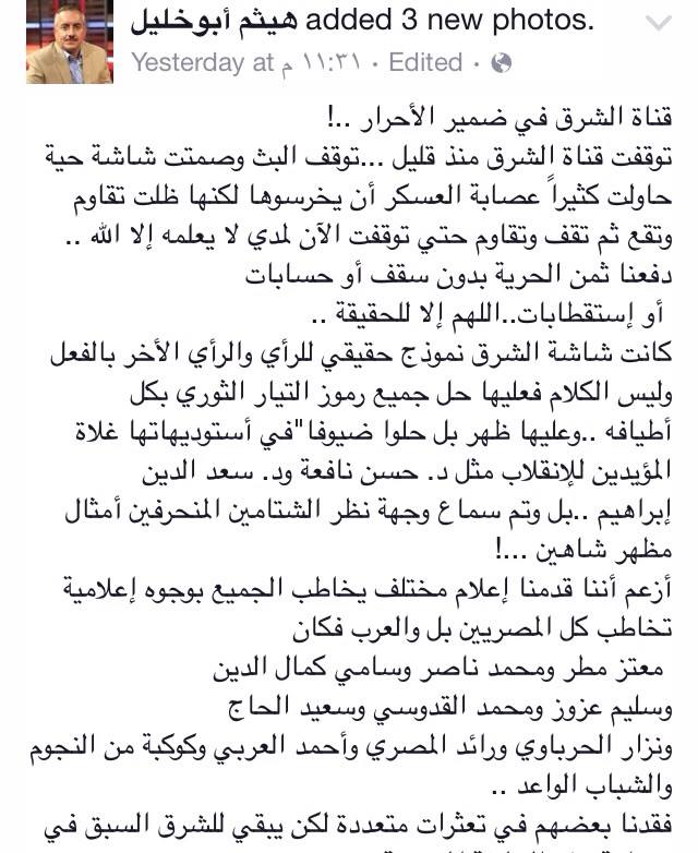 أعلن الناشط الحقوقي والإعلامي، هيثم أبو خليل، مقدم برنامج “حقنا كلنا” على قناة “الشرق”، إغلاق القناة بشكل نهائي، وذلك من خلال بيان رسمي له عبر صفحته الرسمية على موقع التواصل الأجتماعي “فيس بوك”.