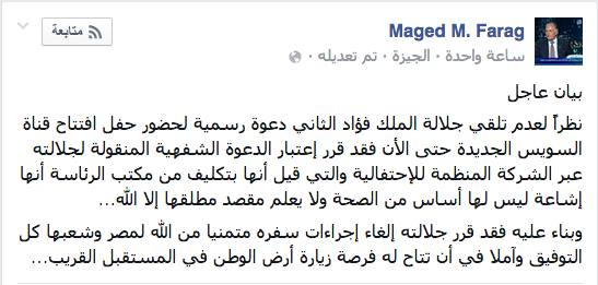 قال ماجد فراج، أحد المقربين من الملك فؤاد، إنه نظرًا لعدم تلقي جلالة الملك فؤاد الثاني، دعوة رسمية لحضور حفل افتتاح تفريعة القناة الجديدة حتى الآن، فقد قرر اعتبار الدعوة الشفهية المنقولة لجلالته عبر الشركة المنظمة للاحتفالية