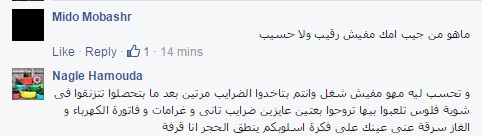 وقد أثارت تلك التصريحات غضب واستياء الكثير من رواد موقع “فيس بوك”، حيث قالت نجلاء حمودة: “وتحسب ليه ما هو مافيش شغل وأنتم بتاخدوا الضرايب مرتين بعد ما بتحصلوا تتزنقوا في شوية فلوس تلعبوا بيها تروحوا باعتين عايزين ضرايب تاني وغرامات وفاتورة الكهرباء والغاز سرقة عيني عينك، على فكرة أسلوبكم ينطق الحجر، أنا قرفت”.