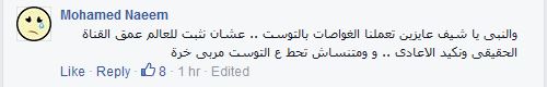 وقال محمد نعيم، ساخرًا: “والنبي يا شيف عايزين تعملنا الغواصات بالتوست.. علشان نثبت للعالم عمق القناة الحقيقي ونكيد الأعادي”. واعتبر محمد مطر في تعليقه على المنشور أن احتفال قناة الحياة بهذا الشكل نوع من “الهبل” على حد قوله.