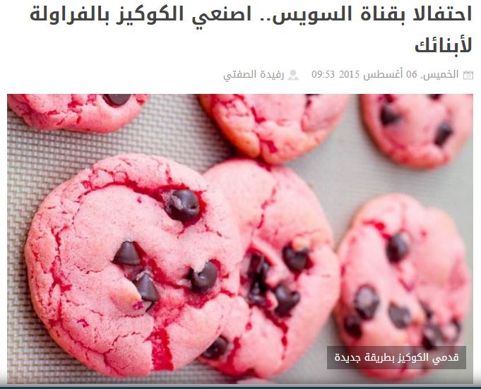 واحتفل موقع “مصر العربية”، بافتتاح التفريعة الجديدة، بصناعة المأكولات؛ حيث نشر على موقعه موضوعًا بعنوان “احتفالًا بقناة السويس.. اصنعي الكوكيز بالفراولة لأبنائك”.