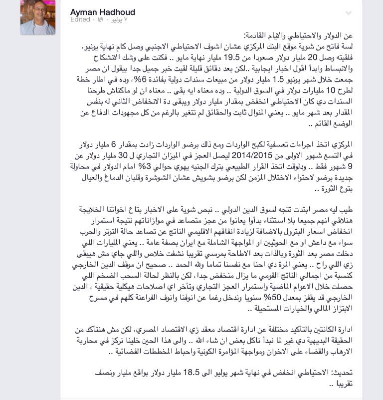 وأضاف: “البنك المركزي اتخذ إجراءات تعسفية لكبح الواردات، ومع ذلك الواردات زادت بمقدار 6 مليارات دولار في التسع شهور الأولى من 2014-2015، ليصل العجز في الميزان التجاري إلى 30 مليار دولار عن 9 شهور فقط، ودلوقتي اتخذ القرار الطبيعي بترك الجنيه يهوي حوالي 3% أمام الدولار، في محاولة جديدة لاحتواء الاختلال المزمن، لكن برضه بشويش علشان الشوشرة وقلبان الدماغ والعيال بتوع الثورة”.