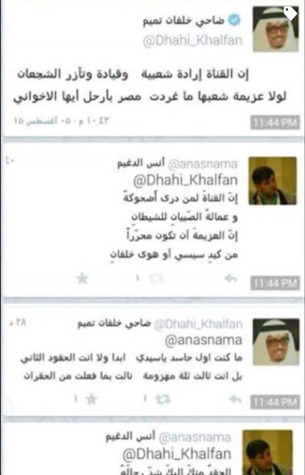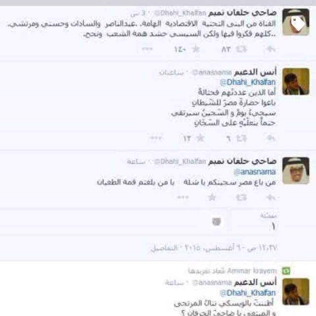 وفي المقابل رد عليه الشاعر السوري أنس الدغيم أن القناة لمن يدري أضحوكة وعمالة الصبيان للشيطان، وأضاف : العزيمة أن تكون محررًا من كيد السيسي و هوي خلفان.