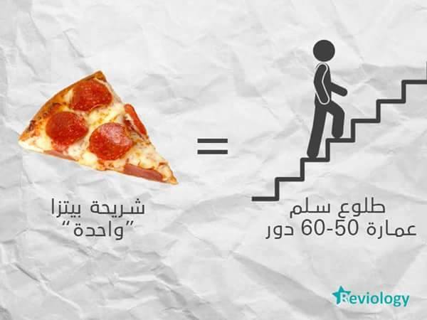 وتعتبر البيتزا من أكثر الأطعمة التي تحتوي على سعرات حرارية عالية، ويمنعها الأطباء عن من يطبقون أنظمة الريجيم، فتناول شريحة واحدة فقط، يلزمه صعود سلم 60 دورًا.