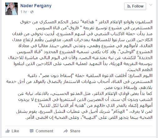 قال الدكتور نادر فرجاني، الأستاذ بجامعة القاهرة، في منشور له بموقع "فيس بوك"، "السلفيون وقوادو الإعلام الداعر" هجّامة تنصل الحكم العسكري من حقوق المستثمرين في مشروع توسيع تفريعة "فاروق"من قناة السويس".
