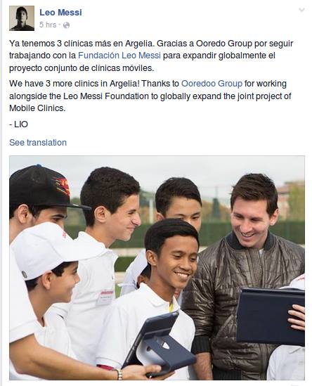 وكتب ميسي -في تصريحاته على موقع التواصل الاجتماعي “تويتر”-: “أصبح لدينا في الوقت الحالي ثلاث عيادات أخرى في الجزائر بفضل مجموعة أوريدو التي عملت جنبًا إلى جنب مع مؤسسة ميسي الخيرية من أجل توسيع مشروع العيادات الطبية”.