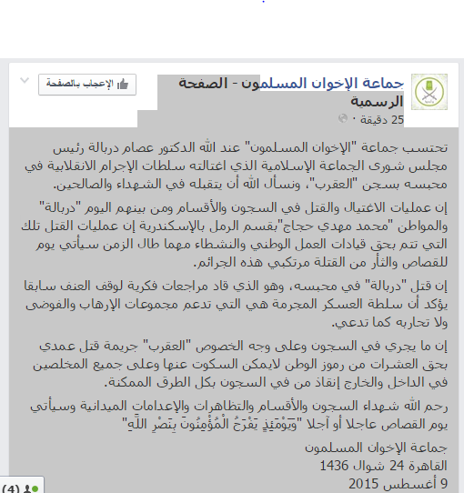 نعت جماعة الإخوان المسلمين، الدكتور عصام دربالة، رئيس مجلس شوري الجماعة الإسلامية، سائلين الله أن يتقبله في الشهداء والصالحين.
