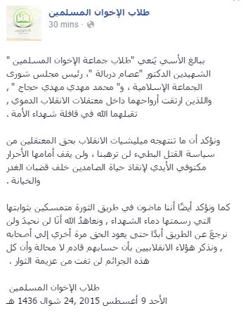 طلاب “الإخوان” ينعون “دربالة” و”حجاج”: لن نقف مكتوفي الأيدي
