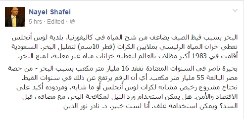 من جهته؛ ذكر الخبير العالمي نائل الشافعي – مدير الموسوعة الإلكترونية “المعرفة” – في تدوينة على حسابه الشخصي على “فيس بوك” نموضجا آخر للحفاظ على المياه، مبينا أن بلدية لوس أنجلس بدأت بتغطية خزان المياه الرئيسي في ولاية كاليفورنيا بملايين الكرات “قطر 10سم” لتقليل البخر، كما أن المملكة العربية السعودية، أقامت في 1983 أكبر مظلات بالعالم لتغطية خزانات مياه غير معلنة، لمنع البخر.