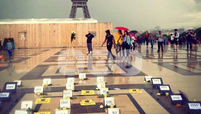 ورغم هطول الأمطار على العاصمة الفرنسية باريس، أقام العديد من المصريين مظاهرة أمام برج إيفل، عرضوا فيها صورا لضحايا مذبحة رابعة العدوية، وما ارتكبته قوات الأمن المصرية من جرائم ضد الإنسانية.