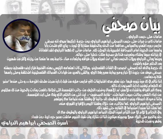 وطالب البيان “بالإفراج الفوري عنه، وإلا سيكون الاعتصام بالنقابة سبيلنا حتى يتم تحقيق مطالبنا”، واختتمت بيانها بقولها: “لا كلام إلا عن التزام أسرة البطل الصامد بالوقوف مع الحق والصبر على البلاء عملاً بوصيته”.
