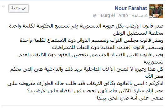 واختتم منشوره قائلًا: “أذكركم: ليس بالقانون يكافح الإرهاب؛ فقد ظلت حالة الطوارئ مفروضة على مصر أيام مبارك ثلاثين عامًا، فهل نجحت في القضاء على الإرهاب؟”.