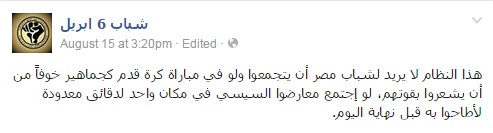 وكتبت -في منشور عبر صفحتها الرسمية على موقع “فيس بوك”-: “هذا النظام لا يريد لشباب مصر أن يتجمعوا ولو في مباراة كرة قدم كجماهير خوفًا من أن يشعروا بقوتهم”.