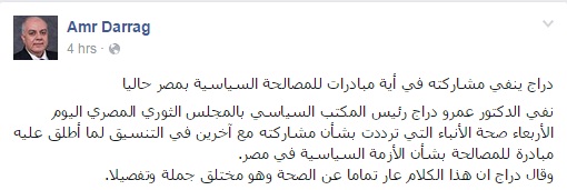 نفى الدكتور عمرو دراج، رئيس المكتب السياسي بالمجلس الثوري المصري، اليوم الأربعاء، الأنباء التي ترددت بشأن مشاركته مع آخرين في التنسيق لما أطلق عليه مبادرة للمصالحة بشأن الأزمة السياسية في مصر.