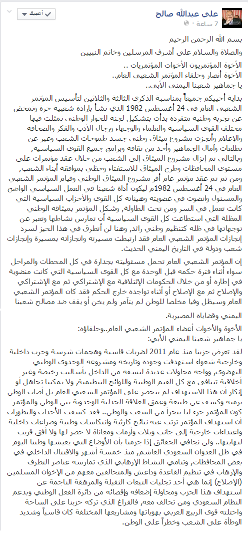 ودعا صالح في بيانه لأعضاء حزب المؤتمر الشعبي العام الذي يرأسه بمناسبة الذكرى الثالثة والثلاثين لتأسيس الحزب، أبناء اليمن لإيقاف الحرب الداخلية، مؤكدًا أن المؤتمر الشعبي العام بكل هيئاته وقواعده “سيظل يدعم كل الجهود الوطنية الرامية إلى تحقيق الأمن والاستقرار الكامل والشامل”.