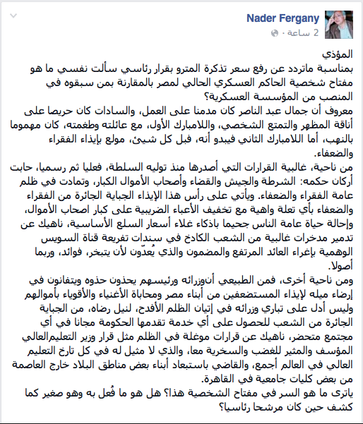 قال الدكتور نادر فرجاني الكاتب والأستاذ بجامعة القاهرة أنه "بمناسبة ماتردد عن رفع سعر تذكرة المترو بقرار رئاسي سألت نفسي ما هو مفتاح شخصية الحاكم العسكري الحالي لمصر بالمقارنة بمن سبقوه في المنصب من المؤسسة العسكرية".