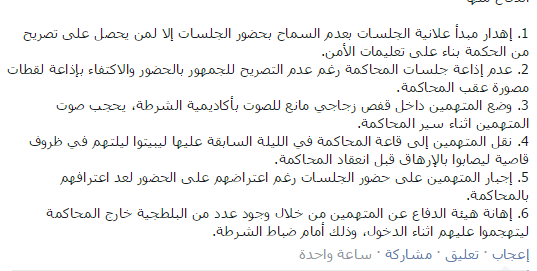 2- عدم إذاعة جلسات المحاكمة رغم عدم التصريح للجمهور بالحضور والاكتفاء بإذاعة لقطات مصورة عقب المحاكمة.