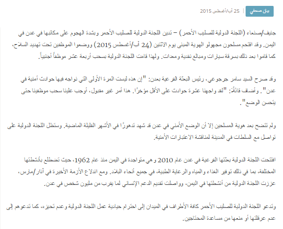 ويأتي هذا بعدما تضاربت التصريحات حول تعليق اللجنة الدولية للصليب الأحمر مؤقتاً لعملياتها الإنسانية في عدن جنوب اليمن، وذلك إثر هجوم على موظفيها شنه متمردو الحوثي.